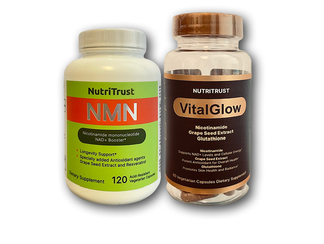 Nutritrust NMN boosts NAD⁺ levels for energy, cellular repair, and healthy aging, while VitalGlow supports skin clarity, detox, and antioxidant defense.